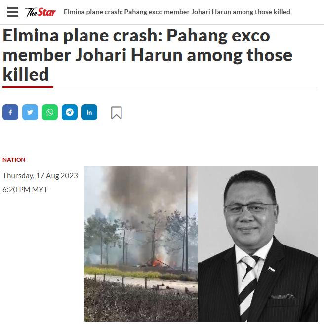 中新網(wǎng)8月17日電 據(jù)馬來(lái)西亞《星州日?qǐng)?bào)》援引警方消息稱,當(dāng)?shù)貢r(shí)間17日,馬來(lái)西亞雪蘭莪州發(fā)生墜機(jī)事故,造成至少10人死亡,其中一名死者為該國(guó)彭亨州行政議員喬哈里·哈倫。