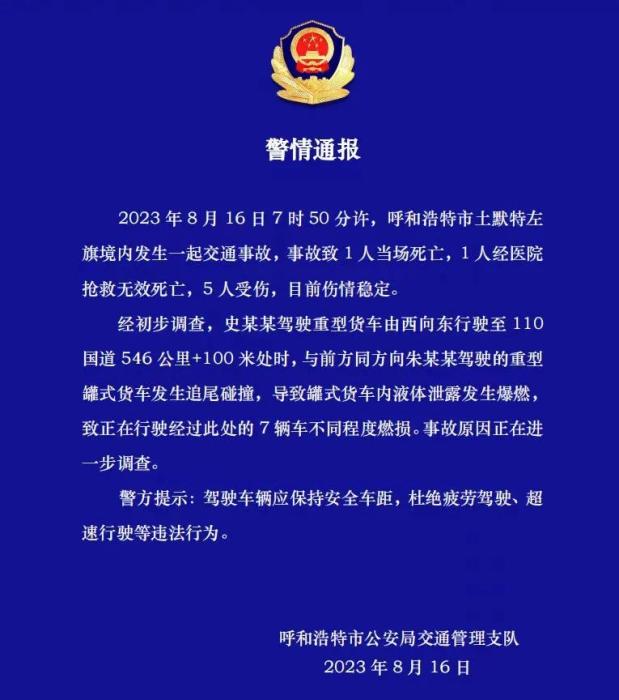 經(jīng)初步調(diào)查,史某某駕駛重型貨車由西向東行駛至110國(guó)道546公里+100米處時(shí),與前方同方向朱某某駕駛的重型罐式貨車發(fā)生追尾碰撞,導(dǎo)致罐式貨車內(nèi)液體泄露發(fā)生爆燃,致正在行駛經(jīng)過(guò)此處的7輛車不同程度燃損。事故原因正在進(jìn)一步調(diào)查。