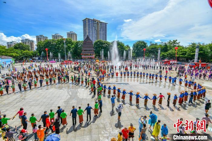 嬉水節(jié)活動現(xiàn)場,臺灣同胞與當?shù)孛癖娨坏垒d歌載舞歡度“七夕”。 駱云飛 攝