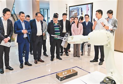 在自動(dòng)檢測(cè)產(chǎn)品外觀缺陷的視覺質(zhì)檢機(jī)器人前,使節(jié)們停下腳步,饒有興致地觀看?;瘕堈f(shuō):“在數(shù)字經(jīng)濟(jì)推動(dòng)下,人工智能等技術(shù)與傳統(tǒng)工業(yè)深度結(jié)合,讓人耳目一新?!?/p>