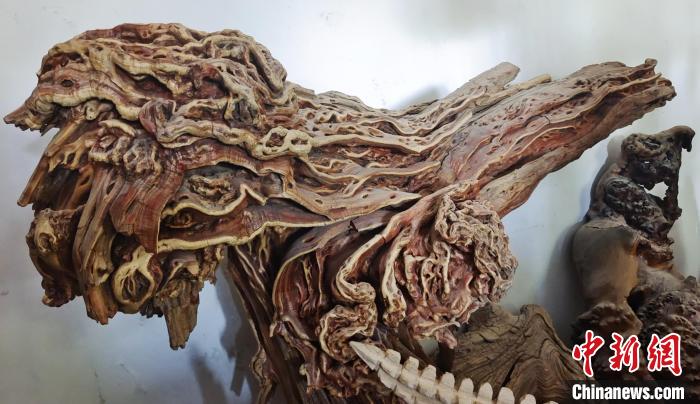 中新網(wǎng)新疆阿拉爾9月2日電(史玉江)一根腐朽的樹根,或許在別人眼里一文不值,可是在戴新看來,朽木可雕琢,那些腐朽的樹根不僅能做成工藝品,還能增收致富?!霸诎⒗瓲栠@片土地上,各種樹根和朽木段,不管是沙漠中的,還是河道里的,只要我看上,都盡可能搬回來?!毙陆a(chǎn)建設(shè)兵團(tuán)第一師阿拉爾市“非遺”根雕傳承人戴新說,通過自己的雙手制作的根雕作品,讓他的生活樂趣無限。