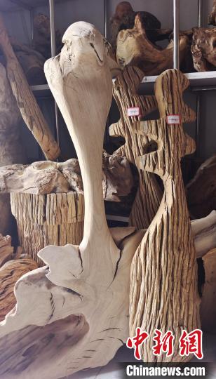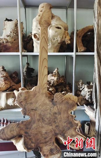 52歲的戴新是新疆生產(chǎn)建設(shè)兵團(tuán)第一師十團(tuán)苗木基地的技工,因長年癡迷于根雕藝術(shù),依靠當(dāng)?shù)囟鄻拥牧謽I(yè)資源制作各類根雕,不僅建起根雕廠,還利用閑置的房屋,分門別類設(shè)立了多間根雕展示廳。