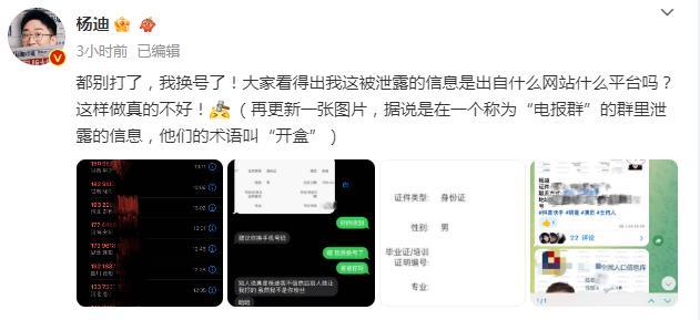 中新網北京9月4日電 今天,#楊迪信息被泄露#登上熱搜。從楊迪在微博上曬出的圖可以看到,他的電話已經被打爆,無奈之下只能換手機號。