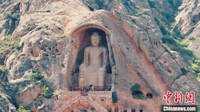 據(jù)悉,須彌山石窟始鑿于北魏孝文帝太和年間,現(xiàn)存洞窟162座,造像1000余軀,壁畫200多平方米,碑刻16方,漢藏西夏文題記53處,分布在4平方公里的五座大山崖面上。作為須彌山石窟的“名片”,第5窟唐代彌勒大佛坐像鑿于紅砂巖質(zhì)山體之上,高達(dá)20.6米,儀態(tài)威嚴(yán)、神情端莊,帛帶袈裟、面龐豐腴,造像氣勢宏偉,雕鑿技藝嫻熟。