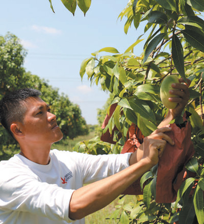 柬埔寨磅士卑省一個芒果園內(nèi),果園主管布南正在細(xì)致檢查芒果長勢。該果園生產(chǎn)優(yōu)質(zhì)芒果,遠(yuǎn)銷至中國、俄羅斯、日本和韓國。