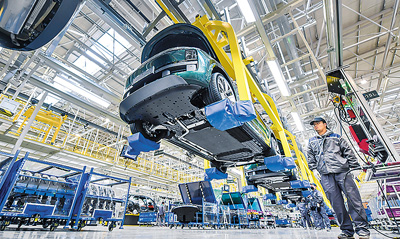 長江經(jīng)濟帶生產(chǎn)制造和出口的新能源汽車日漸成為中國出口的“金名片”。圖為一家車企江蘇常州基地的工人在加緊生產(chǎn)。