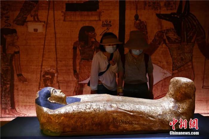 2022年8月18日,“遇見(jiàn)古埃及-木乃伊大型文物特展”在遇見(jiàn)博物館·成都館開(kāi)展,全身鍍金木乃伊棺槨吸引參觀者。攝