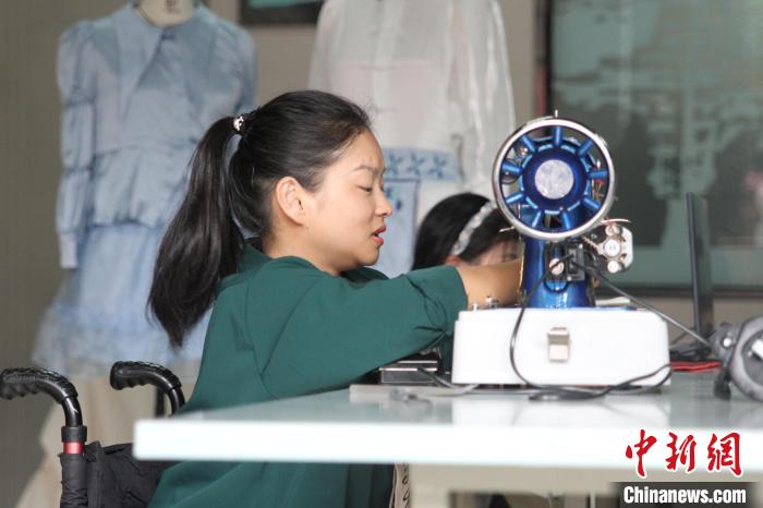 9月7日,在成都紡織高等??茖W(xué)校,“輪椅女孩”張曉麗正在設(shè)計(jì)無(wú)障礙服裝。王利文 攝
