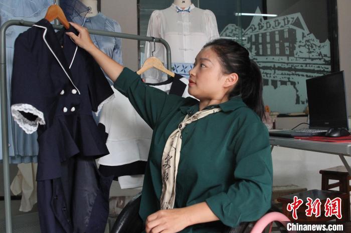 9月7日,成都紡織高等??茖W(xué)校內(nèi),“輪椅女孩”張曉麗展示設(shè)計(jì)的無(wú)障礙服裝。王利文 攝
