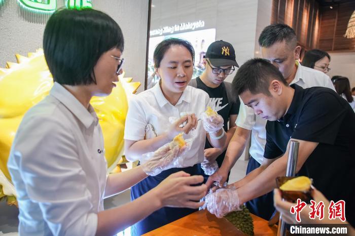 9月14日,廣西南寧消費者搶“鮮”品嘗產(chǎn)自馬來西亞“貓山王之鄉(xiāng)”——彭亨州勞勿縣的榴蓮?!≈行律缬浾?陳冠言 攝