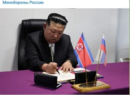 當(dāng)?shù)貢r間16日,金正恩在俄“沙波什尼科夫元帥”號護(hù)衛(wèi)艦貴賓簿上留言。圖片來源:俄國防部社交媒體截圖