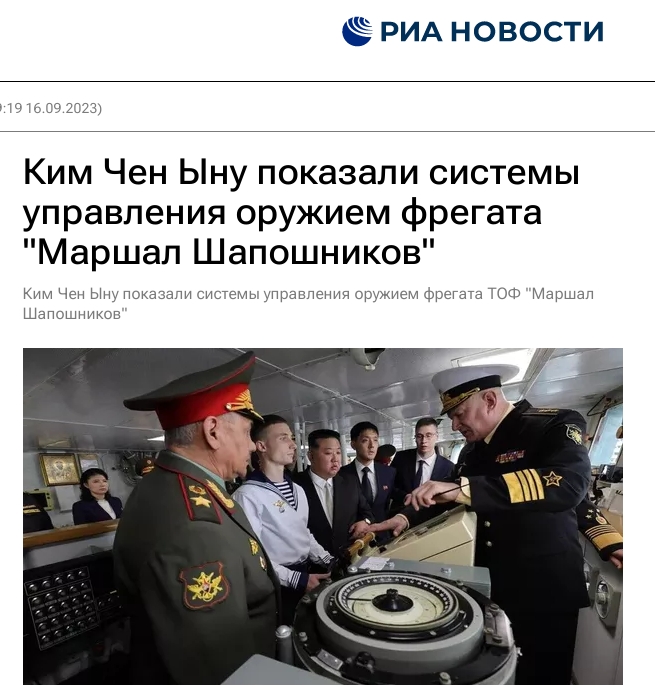 中新網(wǎng)9月16日電 綜合俄媒報道,當(dāng)?shù)貢r間16日,朝鮮最高領(lǐng)導(dǎo)人金正恩抵達(dá)符拉迪沃斯托克市克涅維奇機(jī)場,俄國防部長紹伊古在機(jī)場向金正恩展示了圖-160戰(zhàn)略轟炸機(jī)等戰(zhàn)機(jī)。隨后,一行人登上俄太平洋艦隊“沙波什尼科夫元帥”號護(hù)衛(wèi)艦。