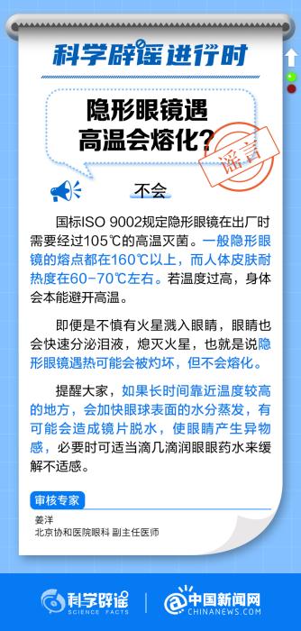 中新網(wǎng)9月20日電 吃火鍋時(shí)戴隱形眼鏡會(huì)熔化嗎?一般隱形眼鏡的熔點(diǎn)都在160℃以上,而人體皮膚耐熱度在60-70℃左右。若溫度過(guò)高,身體會(huì)本能避開(kāi)高溫。即便是不慎有火星濺入眼睛,眼睛也會(huì)快速分泌淚液,熄滅火星,也就是說(shuō)隱形眼鏡遇熱可能會(huì)被灼壞,但不會(huì)熔化。(來(lái)源:@科學(xué)辟謠 @中國(guó)新聞網(wǎng) )
