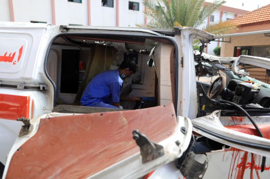 ↑這是10月7日在加沙地帶城市汗尤尼斯拍攝的在以色列空襲中受損的救護(hù)車(chē)。新華社發(fā)(哈立德·奧馬爾攝)