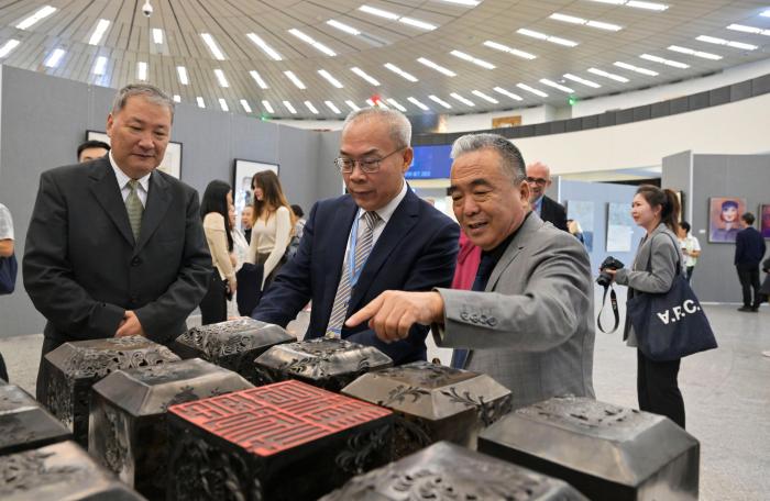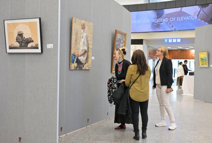 開幕式現(xiàn)場氣氛熱烈,各國外交官及國際職員們被參展藝術(shù)家的作品深深吸引,對中外藝術(shù)家通過當(dāng)代藝術(shù)角度,表達(dá)對中國式現(xiàn)代化應(yīng)對全球性挑戰(zhàn)的思考、傳播推進(jìn)全球發(fā)展事業(yè)和世界發(fā)展合作的意識予以高度評價,對藝術(shù)家的精彩呈現(xiàn)表達(dá)贊嘆。