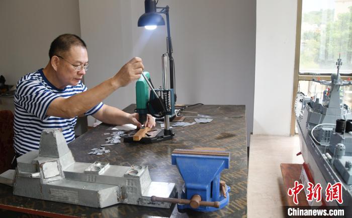 “這艘艦是用鍍鋅板按100∶1的比例制作的,花了我大概3年的業(yè)余時間,純手工制作。”1980年曾服役于東海艦隊,1983年退伍的漳州薌城籍海軍老兵潘雄告訴記者,他專注制作艦艇模型近40年,平均每兩年造一艘,目前已造出“遼寧號”航母、中華神盾艦等各類艦艇20艘模型,并有兩艘055型驅(qū)逐艦?zāi)P驼谥谱髦小?/p>