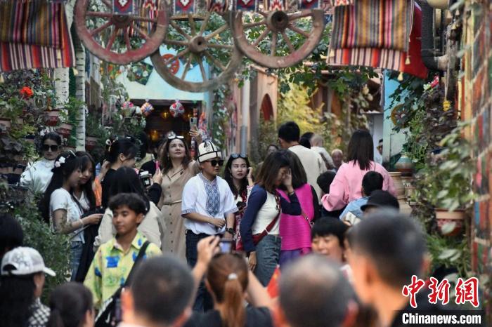雙節(jié)期間,喀什作為新疆重要旅游目的地之一,迎來旅游高峰。10月1日,中新網(wǎng)記者來到喀什古城景區(qū),看到熙熙攘攘的游客們漫步在縱橫交錯的巷道里,時不時駐足停留。10時,在古城東門,觀看開城儀式的游客紛紛拿出手機(jī)打卡??κ补懦蔷皡^(qū)管委會對外宣傳科科長阿地力江·阿不都卡德爾說,今年喀什旅游非?;馃幔芏嘤慰湍矫鴣?,品嘗當(dāng)?shù)孛朗?,感受民族風(fēng)情,帶動了喀什古城景區(qū)的整體經(jīng)濟(jì)發(fā)展。