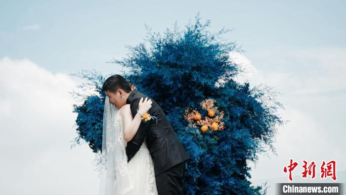 在天藍色的主色調(diào)中,同一片天空下兩朵自由自在的“云朵”相遇了,共同飄向遠方……這是婚禮策劃師趙沖為一對新人打造的夢幻婚禮方案。