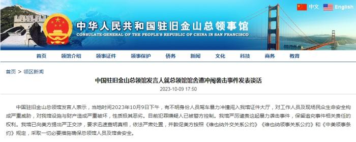 中新網(wǎng)10月10日電 據(jù)中國駐舊金山總領(lǐng)館網(wǎng)站消息,中國駐舊金山總領(lǐng)館發(fā)言人表示,當?shù)貢r間2023年10月9日下午,有不明身份人員駕車暴力沖撞闖入中國駐舊金山總領(lǐng)館證件大廳,對工作人員及現(xiàn)場民眾生命安全構(gòu)成嚴重威脅,對中國駐舊金山總領(lǐng)館設(shè)施與財產(chǎn)造成嚴重破壞,性質(zhì)極其惡劣。