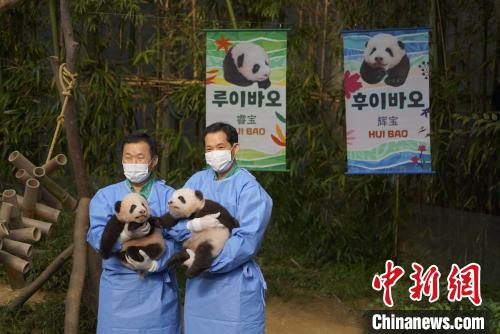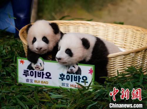 旅韓大熊貓“愛(ài)寶”“樂(lè)寶”的雙胞胎雌性幼崽即將出生滿(mǎn)百日。12日上午,位于韓國(guó)京畿道龍仁市的愛(ài)寶樂(lè)園熊貓館舉行雙胞胎幼崽首次公眾見(jiàn)面會(huì),并公布了它們的名字為“睿寶”和“輝寶”。