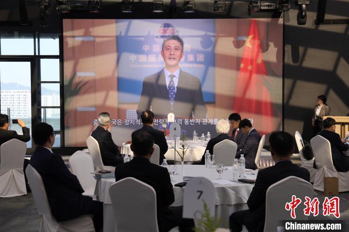 圖為中國外文局副局長兼總編輯高岸明視頻致辭。中新社發(fā) 中國駐韓國大使館 供圖