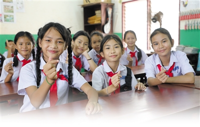 在老撾占塔布里縣中老友好農(nóng)冰村小學(xué)的教室里,學(xué)生們用手比心,表達(dá)對中國的感謝。