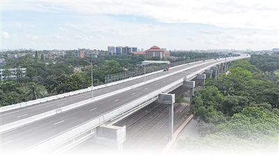 由中國(guó)山東高速集團(tuán)主導(dǎo)投資建設(shè)運(yùn)營(yíng)的孟加拉國(guó)首條高架快速路——達(dá)卡機(jī)場(chǎng)高架快速路項(xiàng)目(一期)通車(chē)儀式9月2日在孟加拉國(guó)首都達(dá)卡舉行。項(xiàng)目通車(chē)后極大改善了達(dá)卡市區(qū)交通狀況。圖為孟加拉國(guó)達(dá)卡機(jī)場(chǎng)高架快速路項(xiàng)目(一期)遠(yuǎn)景。本報(bào)記者 孫廣勇攝