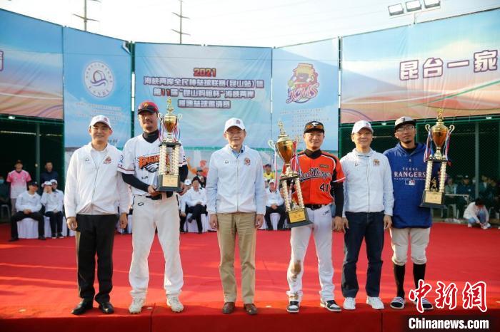 “昆山媽祖杯”海峽兩岸慢速壘球邀請(qǐng)賽已成為昆山的代表性體育賽事。圖為2021年10月24日,嘉賓在閉幕式上為獲得競(jìng)技組前三名的球隊(duì)頒獎(jiǎng)并合影。中新社記者 王駿 攝
