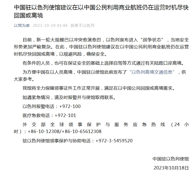 為方便中國(guó)在以人員離境,中國(guó)駐以使館此前發(fā)布了“以色列離境交通信息”。中國(guó)駐以使館將全力保障領(lǐng)事證件工作正常開(kāi)展,滿足在以中國(guó)公民回國(guó)或離境需求。