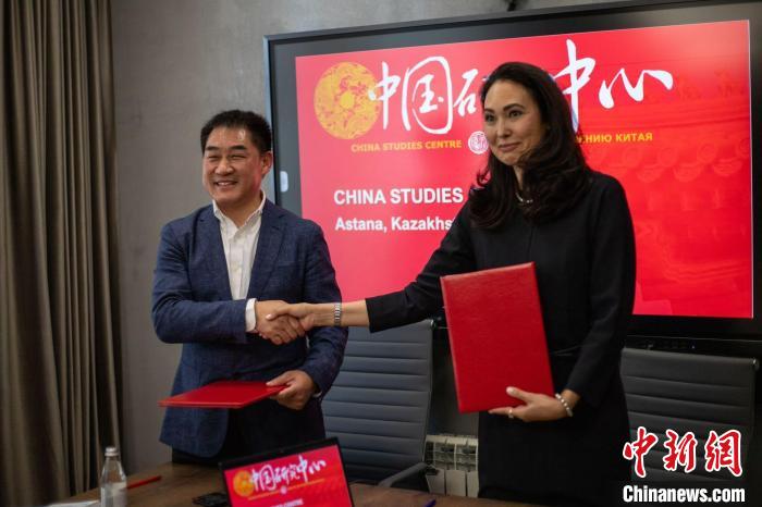 當(dāng)?shù)貢r(shí)間24日,哈薩克斯坦阿斯塔納,哈薩克斯坦中國研究中心主任古麗娜爾與上海交通大學(xué)醫(yī)學(xué)院院長辦公室副主任童天朗簽署合作備忘錄?! ≈鬓k方供圖