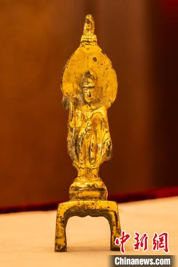 中國駐澳大利亞大使館舉行儀式,接收澳方向我國返還共4件流失文物藝術(shù)品與1件古生物化石。圖為隋晚期至唐銅鎏金佛立像?!椅奈锞止﹫D