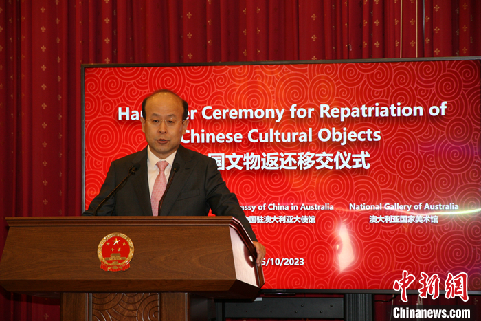 當?shù)貢r間10月25日上午,經(jīng)中國國家文物局授權(quán),中國駐澳大利亞大使館在堪培拉舉行儀式,接收澳方向中國返還共4件流失文物藝術(shù)品與1件古生物化石。中國駐澳大利亞大使肖千在致辭中表示,這些文物回歸祖國,顯示了中澳兩國政府對于保護文化遺產(chǎn)的共同承諾,是雙方文化遺產(chǎn)交流的一次盛事和友好合作的見證。 中新社記者 顧時宏 攝