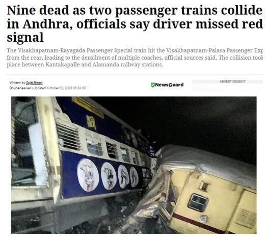 印度鐵道部高級官員稱,追尾列車的司機錯過了信號燈?!八J了紅燈……這是一起追尾事故。前面的列車行駛速度非常慢。”