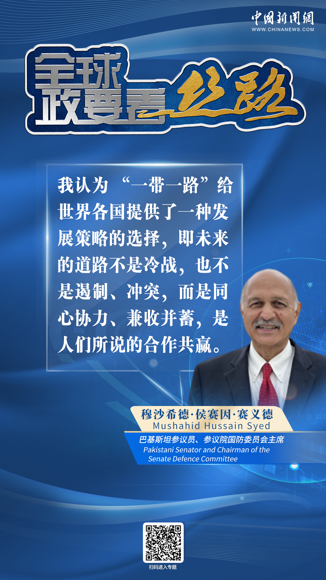 中新網(wǎng)10月28日電(張乃月) “‘一帶一路’給世界各國(guó)提供了一種發(fā)展策略的選擇,即未來的道路不是冷戰(zhàn),也不是遏制、沖突,而是同心協(xié)力、兼收并蓄,是人們所說的合作共贏?!卑突固箙⒆h員、參議院國(guó)防委員會(huì)主席穆沙希德·侯賽因·賽義德近日接受中新網(wǎng)專訪時(shí)如是說。