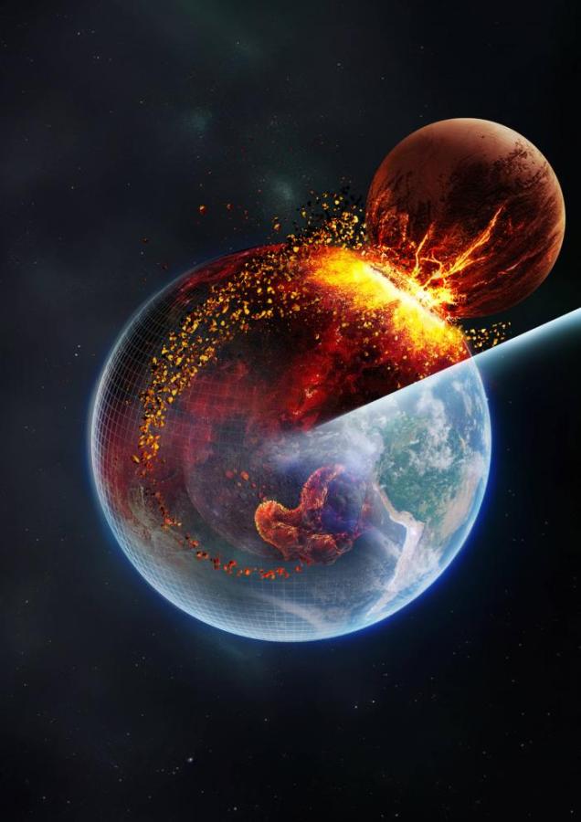 本項研究成果藝術想象圖:月球形成的撞擊中,行星忒伊亞的一部分一直存留在地幔深處直到今天(制圖Herna n Can ellas)。施普林格·自然 供圖
