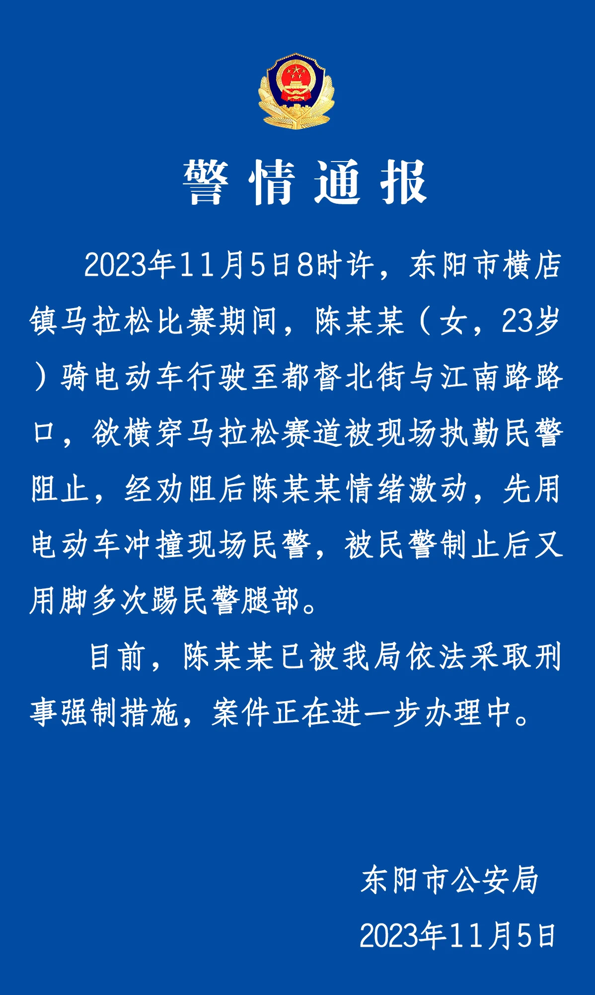 中新網(wǎng)金華11月6日電(董易鑫)浙江金華東陽市公安局11月5日發(fā)布警情通報(bào)稱,2023年11月5日8時(shí)許,東陽市橫店鎮(zhèn)馬拉松比賽期間,陳某某(女,23歲)騎電動(dòng)車行駛至都督北街與江南路路口,欲橫穿馬拉松賽道被現(xiàn)場執(zhí)勤民警阻止,經(jīng)勸阻后陳某某情緒激動(dòng),先用電動(dòng)車沖撞現(xiàn)場民警,被民警制止后又用腳多次踢民警腿部。