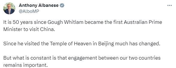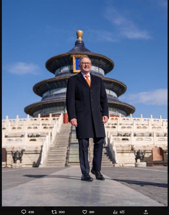 阿爾巴尼斯在社交媒體上發(fā)布了多張參觀天壇的照片,并發(fā)文稱,“50年前,高夫·惠特拉姆成為首位訪華的澳大利亞總理。自從他參觀北京的天壇以來,已經(jīng)發(fā)生了很大變化。但不變的是,我們兩國之間的接觸仍然很重要。”