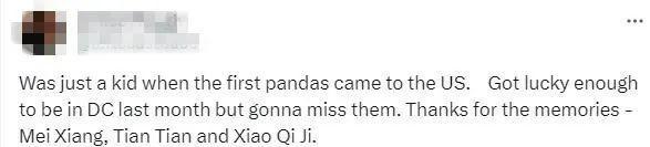 有網(wǎng)友回憶起與大熊貓的點(diǎn)滴時(shí)說,“當(dāng)?shù)谝慌笮茇垈儊淼矫绹鴷r(shí),我還只是個(gè)孩子。上個(gè)月很幸運(yùn)能前往華盛頓,我會想念它們的。謝謝你們帶來的回憶——美香、添添和小奇跡?!?/p>