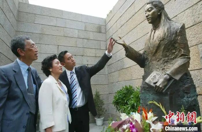 2005年,侵華日軍南京大屠殺遇難同胞紀念館內,張紹進、張盈盈(左)為女兒張純如雕塑揭幕。(資料圖) 中新社記者 泱波 攝