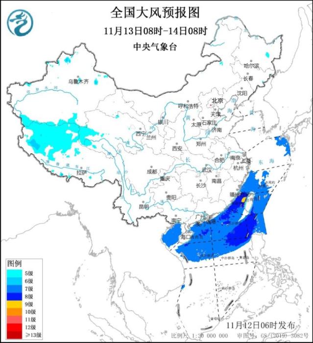 12日08時(shí)至13日08時(shí),新疆沿天山地區(qū)和南疆盆地、青海東部和西部、福建東南部沿海地區(qū)、臺(tái)灣島等地部分地區(qū)將有5~6級(jí)、陣風(fēng)7~8級(jí)的大風(fēng);東海大部海域、臺(tái)灣海峽、臺(tái)灣以東洋面、巴士海峽、南海北部和中部海域、北部灣將有7~8級(jí)、陣風(fēng)9級(jí)的大風(fēng),其中臺(tái)灣海峽部分海域風(fēng)力可達(dá)9級(jí)、陣風(fēng)10級(jí)。13日08時(shí)至14日08時(shí),新疆南疆盆地、西藏北部和西部、青海西部、福建東南部沿海地區(qū)、臺(tái)灣島等地將有5~6級(jí)、陣風(fēng)7~8級(jí)的大風(fēng);東海南部海域、臺(tái)灣海峽、臺(tái)灣以東洋面、巴士海峽、南海北部和中部海域、北部灣、瓊州海峽將有7~8級(jí)、陣風(fēng)9級(jí)的大風(fēng),其中臺(tái)灣海峽部分海域風(fēng)力可達(dá)9級(jí)、陣風(fēng)10級(jí)。中央氣象臺(tái)11月12日06時(shí)繼續(xù)發(fā)布大風(fēng)藍(lán)色預(yù)警。