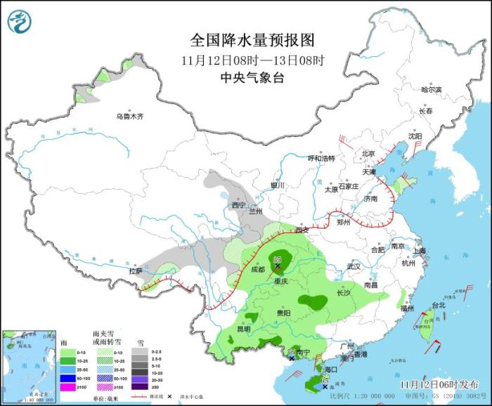 全國(guó)降水量預(yù)報(bào)圖(11月12日08時(shí)-13日08時(shí))