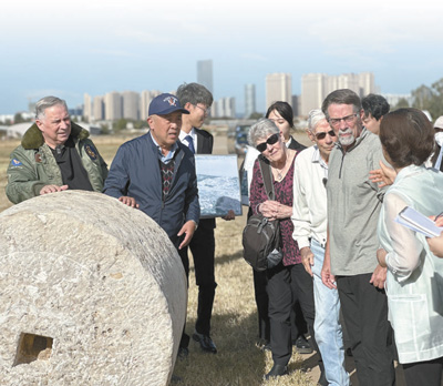 在云南昆明呈貢機場舊址,代表團一行聆聽講解員講述石碾背后的故事。呈貢機場曾是飛虎隊在昆明的主要基地之一,機場建設(shè)期間,當(dāng)?shù)厝嗣窭瓌泳薮笫肫秸艿溃冻銎D苦努力。
