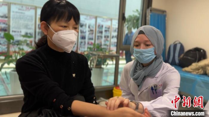 11月中旬,李峰的妻子瑪麗亞(右),作為甘肅中醫(yī)藥大學(xué)附屬醫(yī)院俄羅斯實(shí)習(xí)生,為甘肅患者把脈。王牧雨 攝