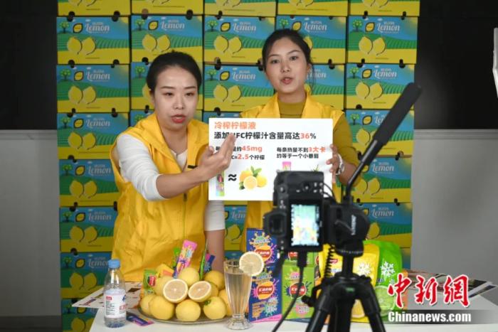 圖片圖為工作人員通過(guò)直播銷售檸檬。張旭 攝