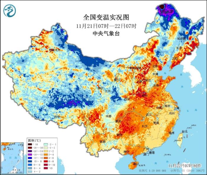 寒潮黃色預(yù)警:22日08時(shí)至24日08時(shí),陜西中北部、寧夏北部、內(nèi)蒙古、東北地區(qū)、華北、黃淮、江淮、江南東北部等地氣溫將先后下降6~10℃,其中,內(nèi)蒙古中東部、東北地區(qū)中東部、河北北部、山西北部、山東大部等地降溫12~14℃,上述部分地區(qū)降溫可達(dá)16~20℃。24日早晨,最低氣溫0℃線(xiàn)將位于蘇皖中部至河南中南部、陜西南部、甘肅東南部等地,內(nèi)蒙古東部和黑龍江大部最低氣溫將降至-20℃以下,局地可達(dá)-30℃以下。