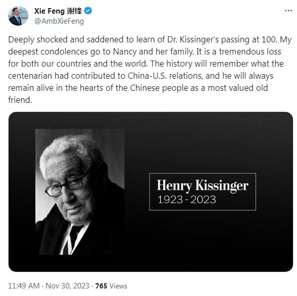 中新網(wǎng)11月30日電 綜合報道,當(dāng)?shù)貢r間11月29日,美國前國務(wù)卿基辛格去世。對此,中國駐美國大使謝鋒在社交平臺上發(fā)文稱,基辛格去世對中美兩國和世界來說都是巨大的損失,歷史將銘記這位百歲老人為中美關(guān)系作出的貢獻(xiàn)。