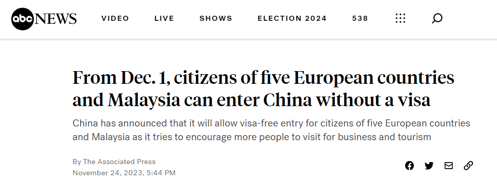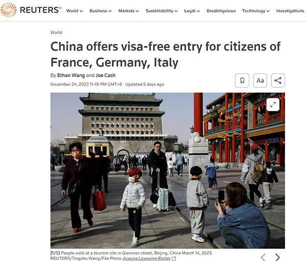 路透社報道稱,中國外交部宣布,2023年12月1日至2024年11月30日期間,上述國家持普通護(hù)照人員來華經(jīng)商、旅游觀光、探親訪友和過境不超過15天,可免辦簽證入境。