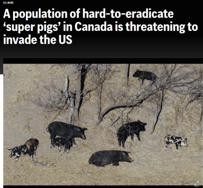 報道稱,“超級豬”目前很有可能南下進入美國,包括明尼蘇達州、北達科他州以及蒙大拿州等美國北部多州正嚴陣以待防止“超級豬”入侵。