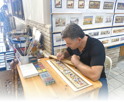 一名畫師在布哈拉一處集市內(nèi)創(chuàng)作有關(guān)古絲綢之路的畫作。