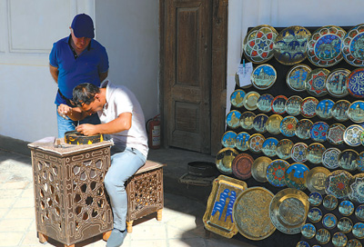 在布哈拉雅克城堡內(nèi),手工藝人正在制作極具當(dāng)?shù)靥厣氖止に嚻贰?/p>